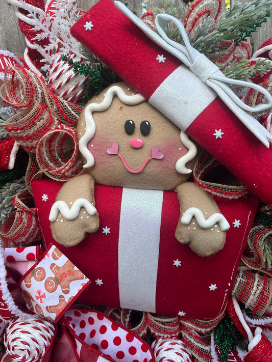Christmas Gingerbread in a present front door wreath, Festive front door decor with Gingerbread and presents, Holiday decor for the home, Gingerbread collection