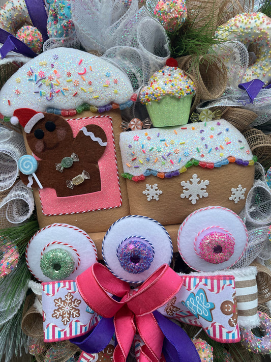 Christmas Gingerbread Train Wreath - Festive Candy Theme Door Decor with Cupcakes, Donut and bows, Holiday front door decoration