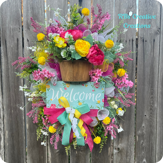 Spring Welcome Wreath for Front Door – Colorful Floral Door Hanger with Pink Yellow Flowers – Farmhouse Porch Décor – Summer Entryway Wreath