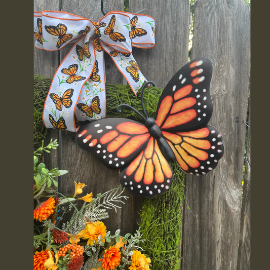 Monarch Butterfly Wreath for Front Door – Summer & Spring Wreath with Orange Florals, Moss Backing & Large Butterfly Accent