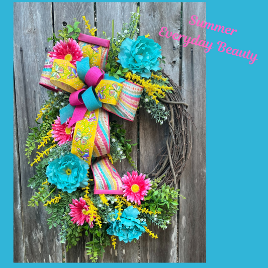 Bright Butterfly Garden Wreath – Vibrant Summer Front Door Decor with Teal & Hot Pink Florals