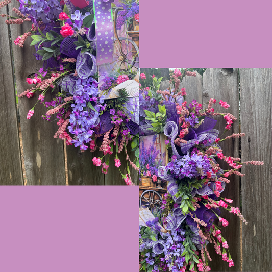 Purple Summer Door Decor with Wildflowers, Whimsical Country Farmhouse Style,Lavender Cart Wreath with Florals & Bows