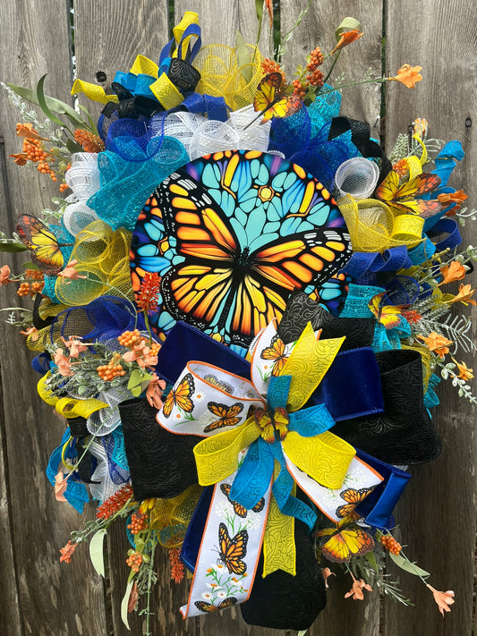 Spring-Summer Butterfly wreath for front door, stained glass decor, summer wreath for front porch, mother's day gift, home decor