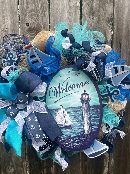 Coastal Welcome Wreath for front door, nautical decor, beach inspired wreath, lighthouse decor, summer wreath, home decor, beach cottage