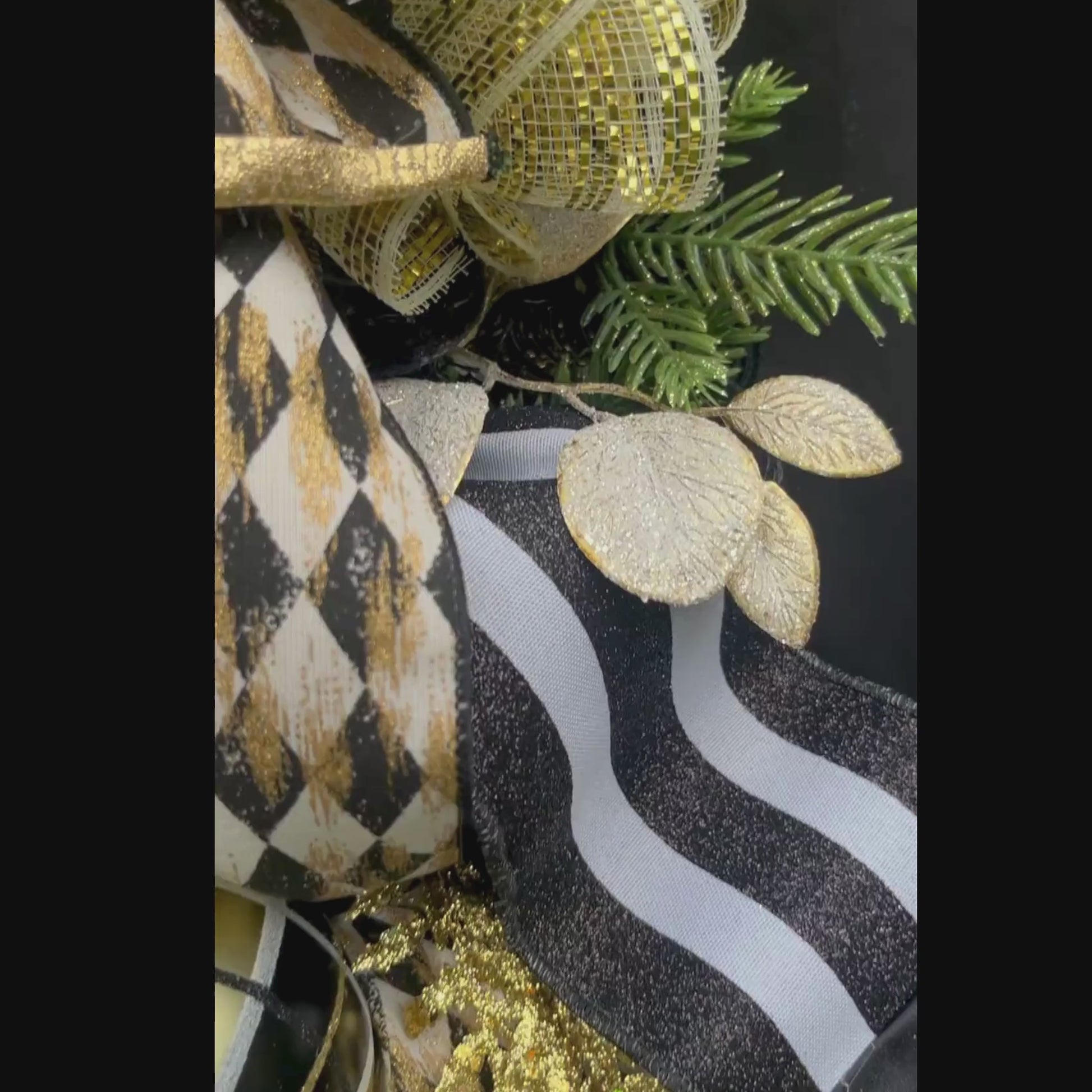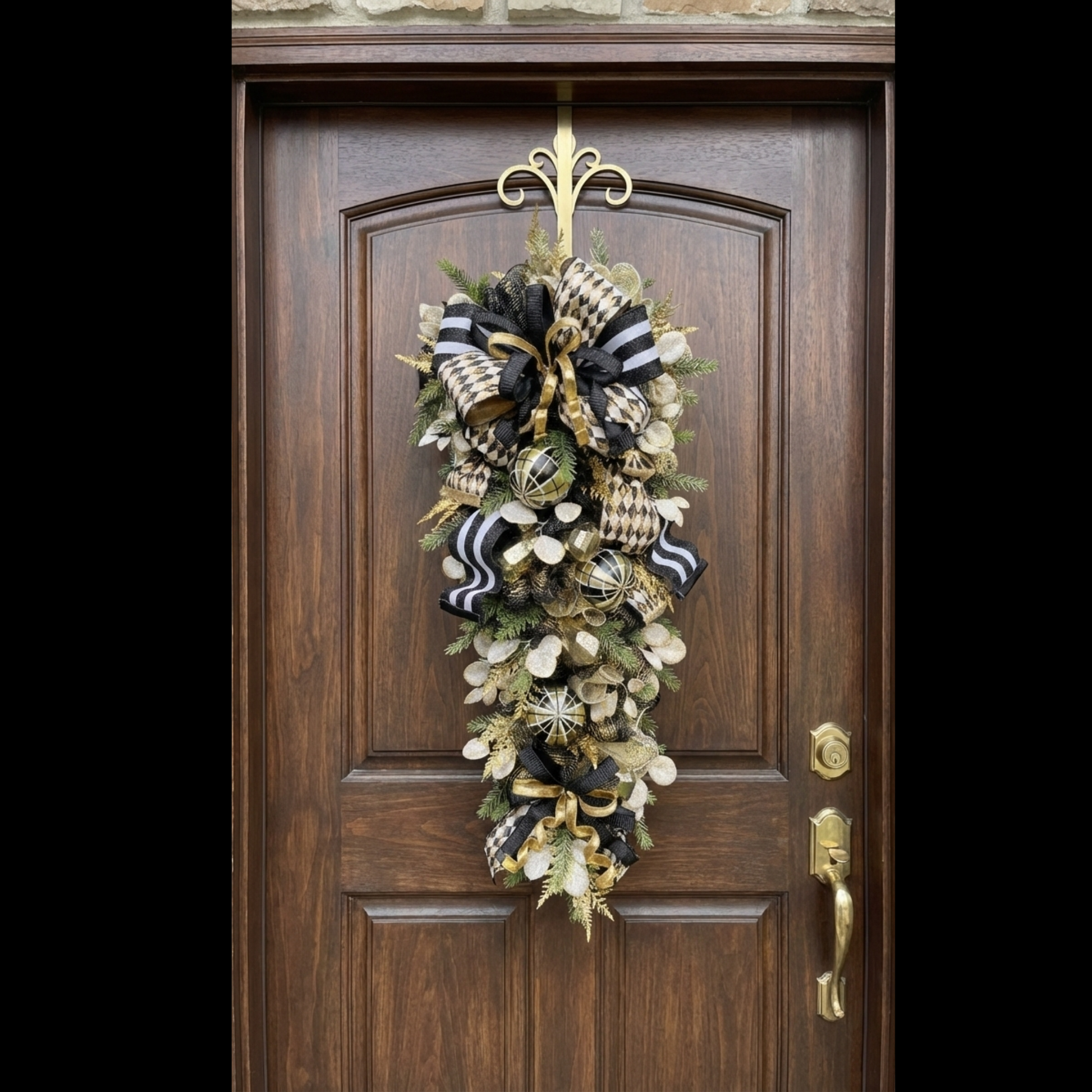 Turn your front door into a show-stopping statement with this elegant black and gold vertical swag, designed to bring luxury, drama, and timeless charm to your home.